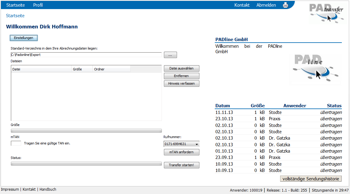 Die Kommunikation zwischen Praxissystem und PVS-Server ist mit Hilfe des SSL-Protokolls (Secure-Socket-Layer-Protokoll) abgesichert. Das SSL-Protokoll garantiert, dass sich das Praxissystem nur mit einem vertrauenswürdigen Server verbindet, der in Besitz eines entsprechenden SSL-Zertifikates ist. Zum anderen gewährleistet es, dass die übertragenen Daten während der Übermittlung über das Internet sicher verschlüsselt sind. Zur Authentifizierung des Absenders kommt optional das aus dem Elektronik-Banking bekannte mTAN-Verfahren zum Einsatz. Bei diesem Verfahren muss der Nutzer vor dem Datenversand eine mTAN (mobile TAN) anfordern. Die mTAN wird per SMS an das Mobiltelefon des Nutzers geschickt und muss dann in PAD transfer eingetragen werden, um den Daten-Upload zu bestätigen.