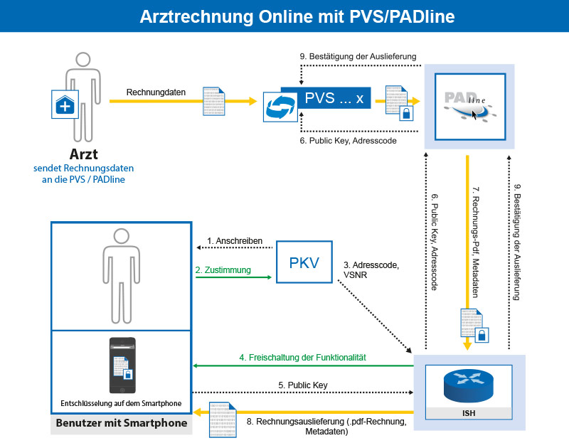 Voraussetzung hierfür ist die Nutzung einer iPhone-App der Versicherung des Patienten. Der Patient meldet sich bei seiner Versicherung für das Verfahren an und bekommt die Arztrechnungen zukünftig online auf seinem Smartphone zugestellt. Natürlich ist auch dieses Verfahren hochsicher. Eine Ende-zu-Ende-Verschlüsselung zwischen Abrechner und Smartphone sorgt dafür, dass nichts und niemand die Rechnungen einsehen kann.